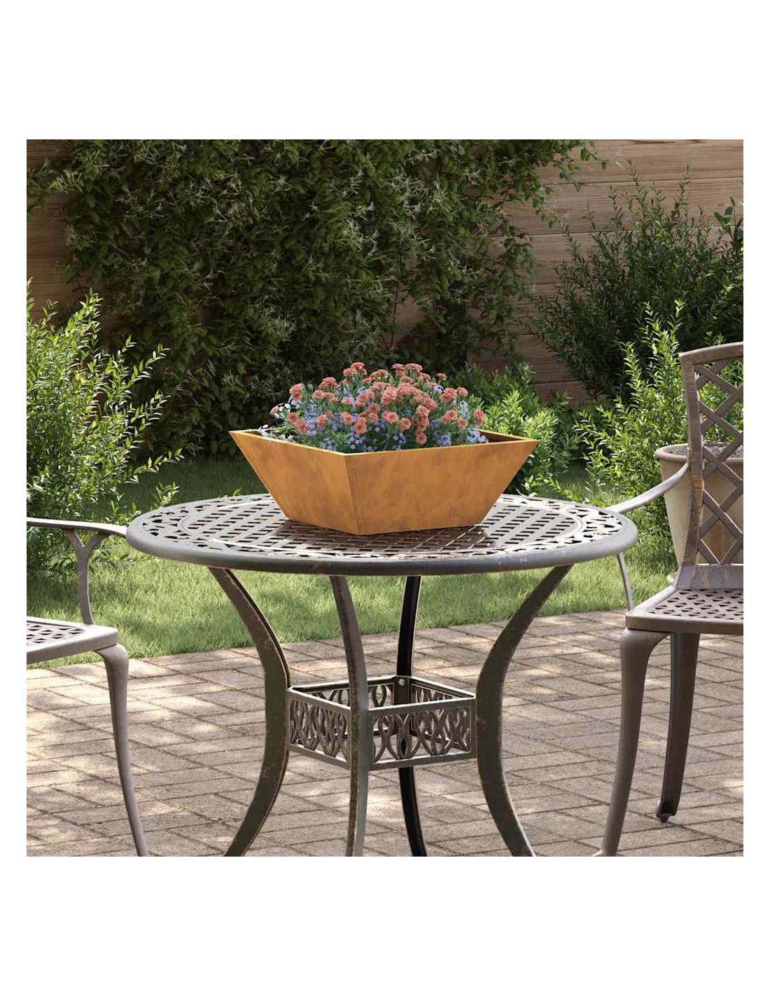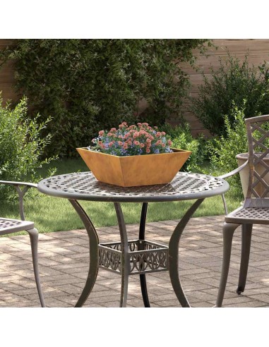 Сърцевината на този цветарник е неговият иновативен материал – патинираща стомана. Тази здрава метална конструкция е известна със способността си да образува плътен, защитен слой от ръжда (патина) при излагане на атмосферни условия. Този процес не само осигурява уникален външен вид, но и прави съда изключително устойчив на времето и дълготраен. Допълнителната UV-устойчивост гарантира, че той ще запази своя вид и стабилност през лятото и след това.